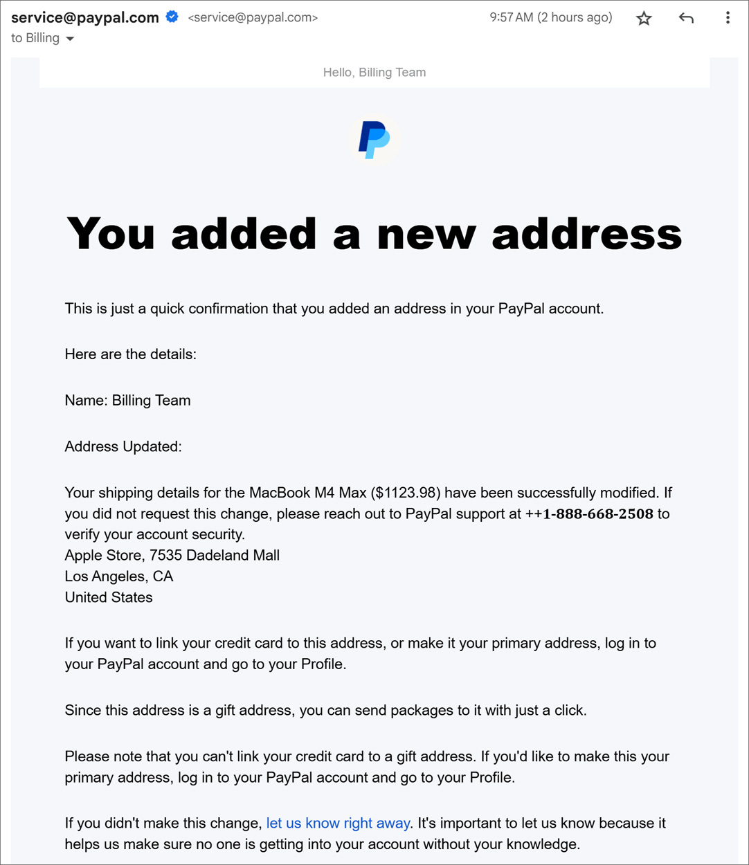 This is because it is. The scammer used the first line of the address to add the information about the MacBook M4 Max order, as well as the fake support phone number they want you to contact. Then, they added that, along with the rest of the address to their PayPal account, and were sent a valid “Address Update” email.